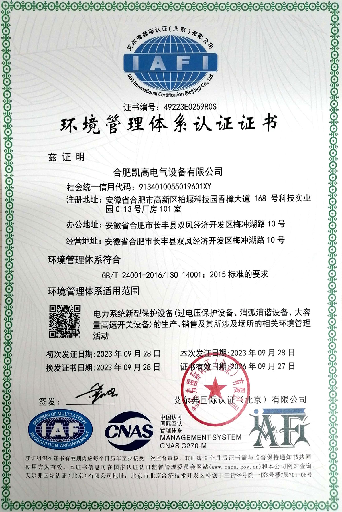 環境管理體系認證證書